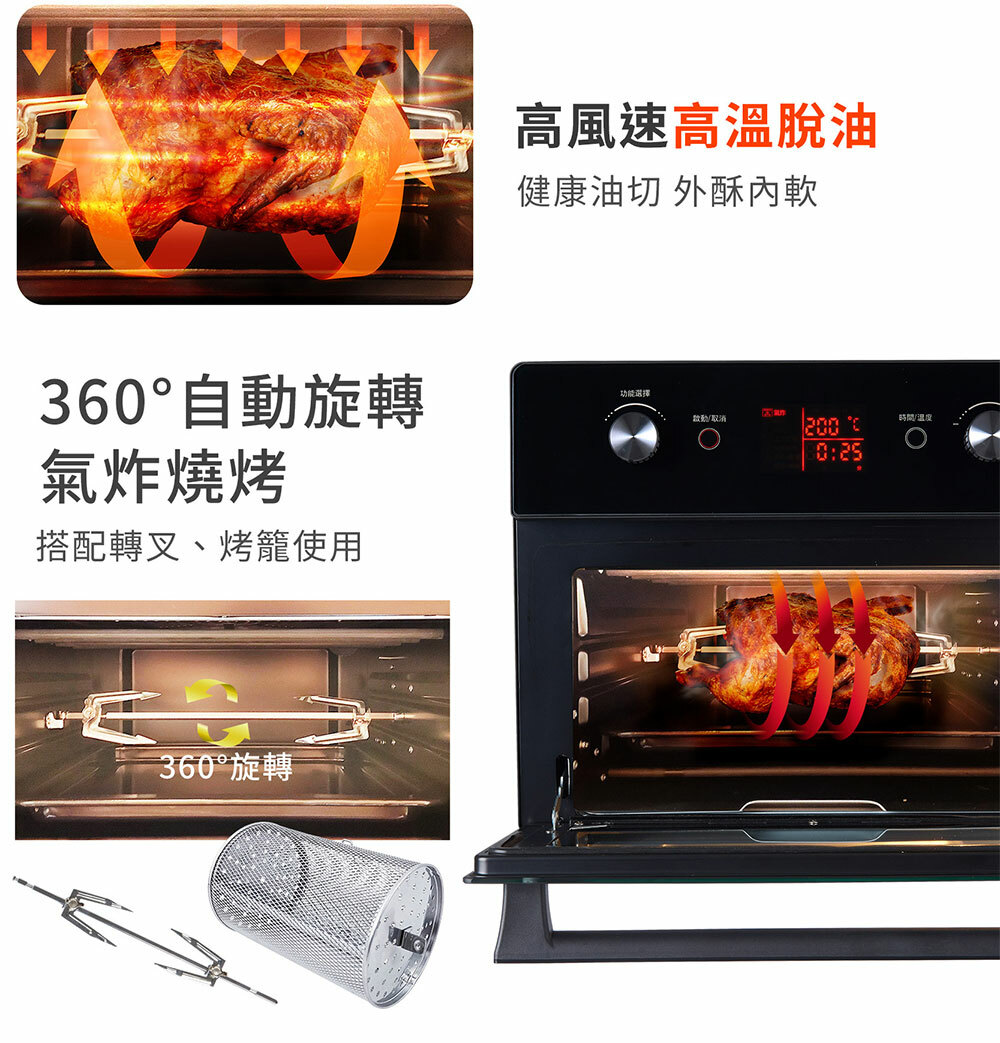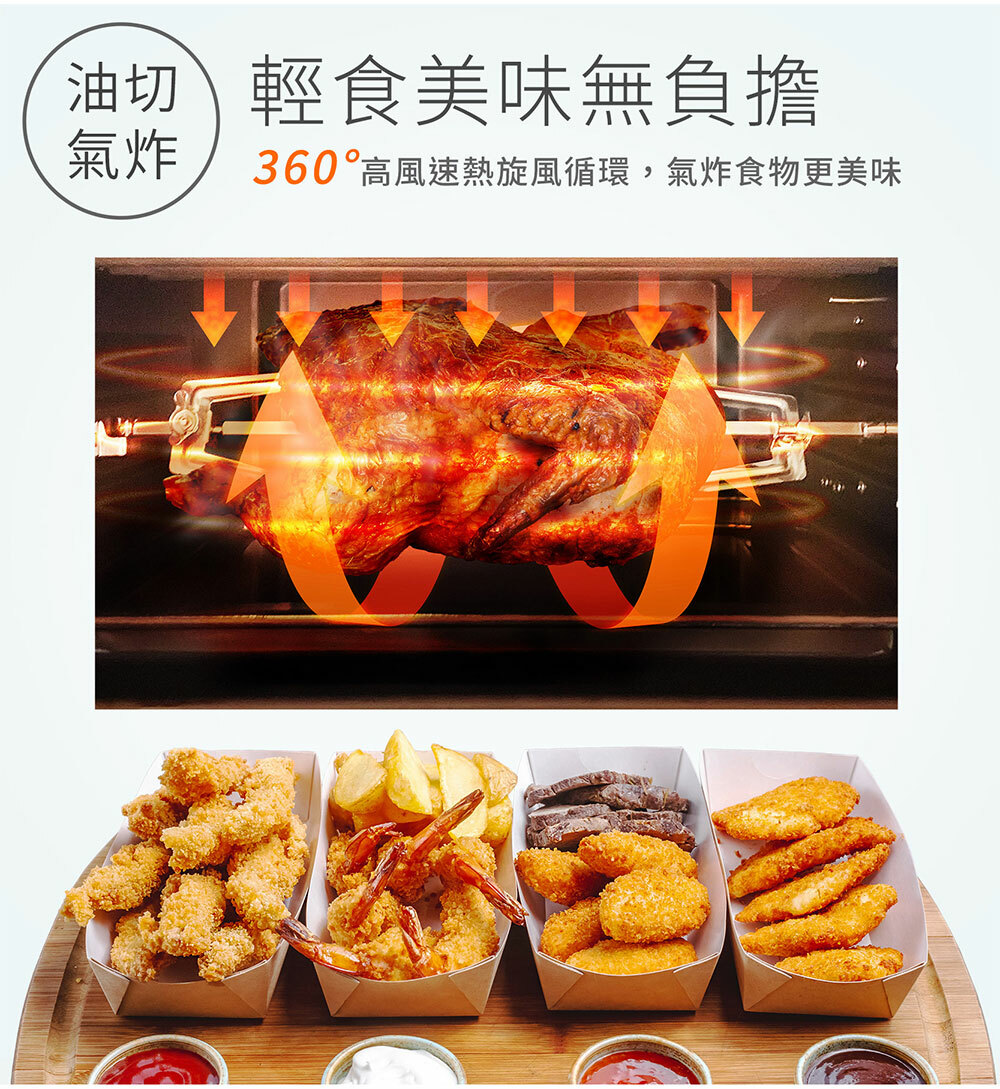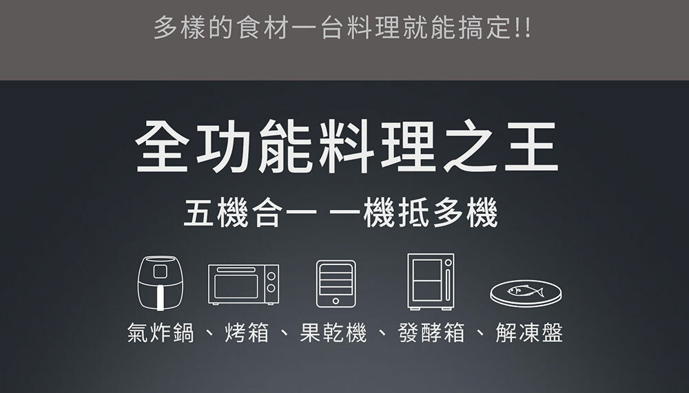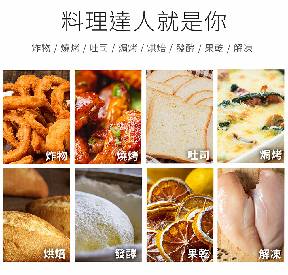 ★ 五機合一全功能料理王:氣炸鍋、烤箱、果乾機、發酵箱、解凍盤