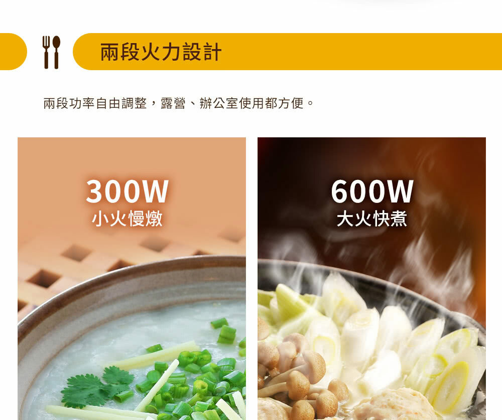 ★ 2段火力 (300W / 600W),露營/辦公室皆適用